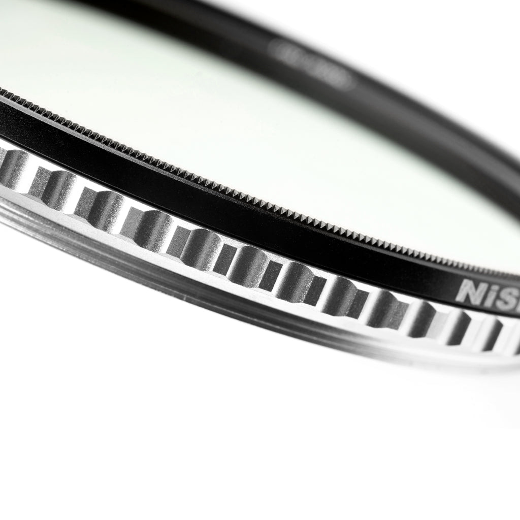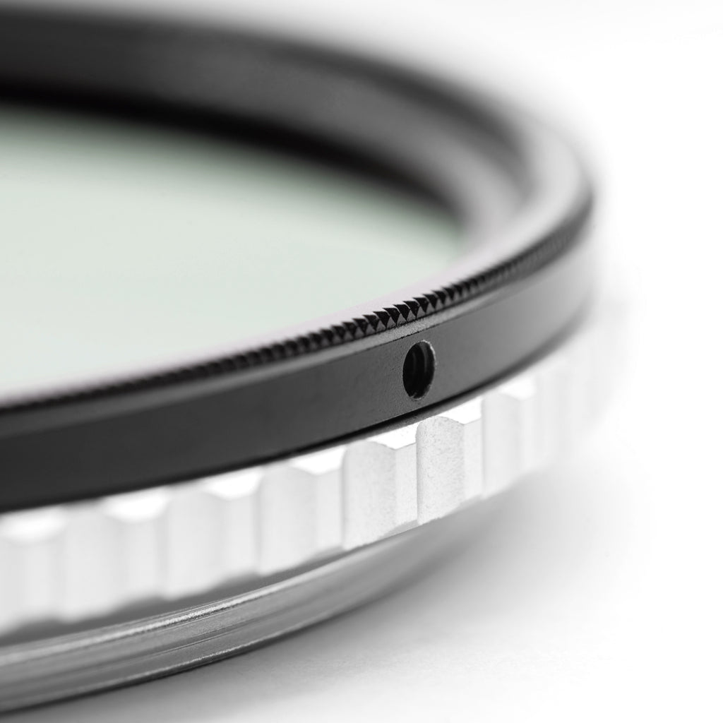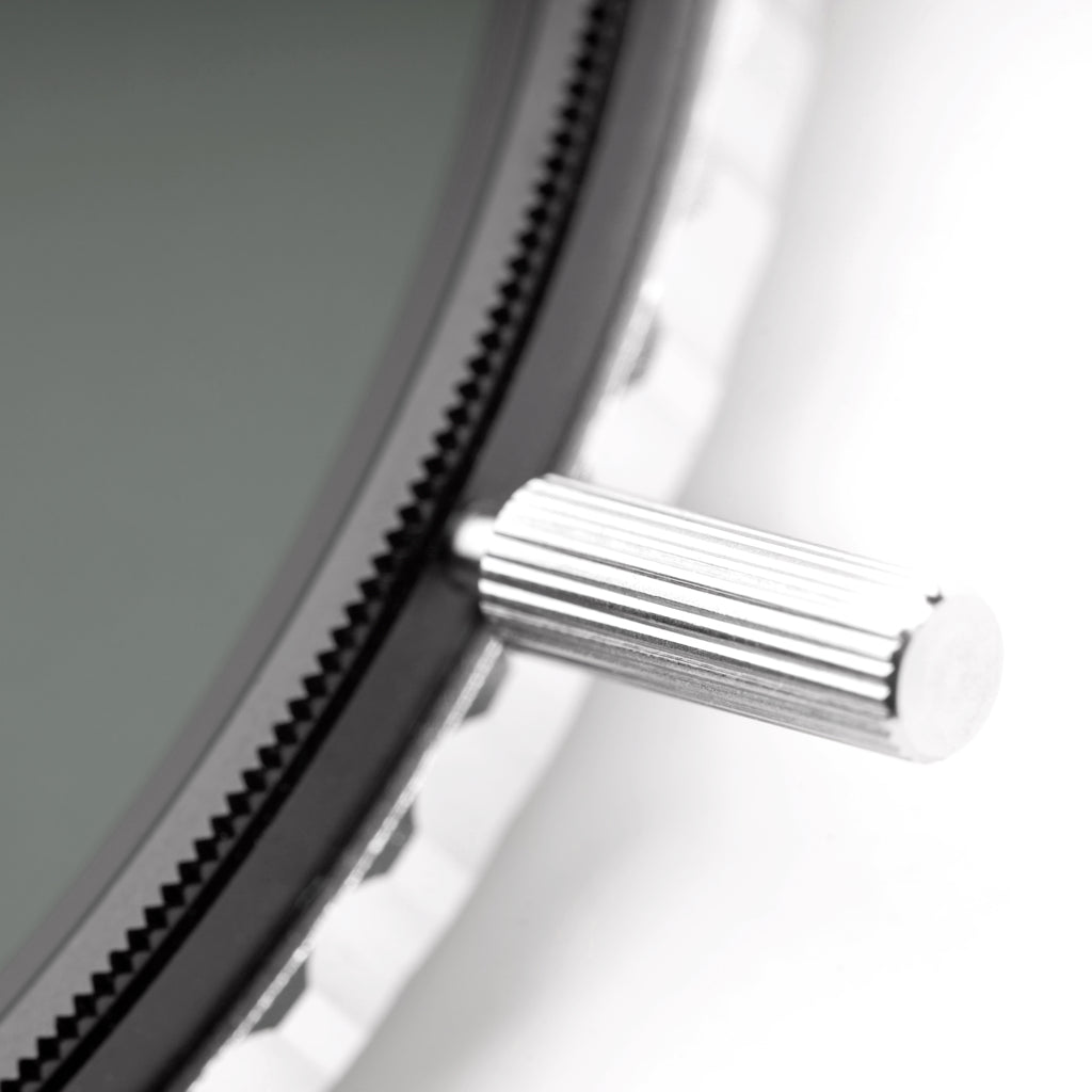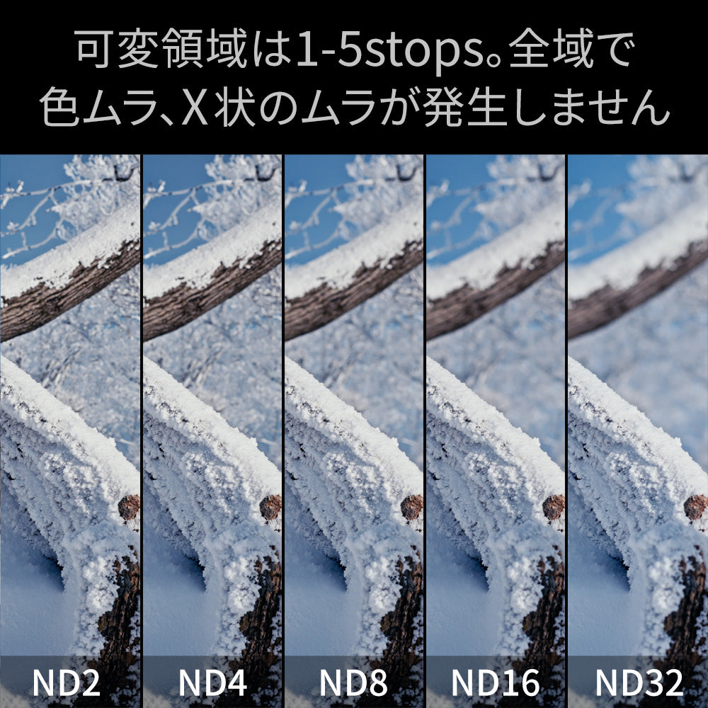1〜5ストップ(ND2〜32)の範囲でND濃度を調整できる可変NDフィルター。ストッパーによりフィルターの可動域を制御することで、X状のムラが発生を抑え、NiSi独自のTRUE COLORテクノロジーが可変NDの課題であった黄色かぶりを解消しました。さらに、ゴーストやフレアを抑制するナノコーティング技術、フィルター表面についた水滴や指紋をサッと拭くだけできれいにできる撥水防汚コーティング、過酷な環境でも長年使い続けられる耐久性など、可変NDフィルターの様々な課題を新たなテクノロジーで解決した新世代の可変NDフィルターです。